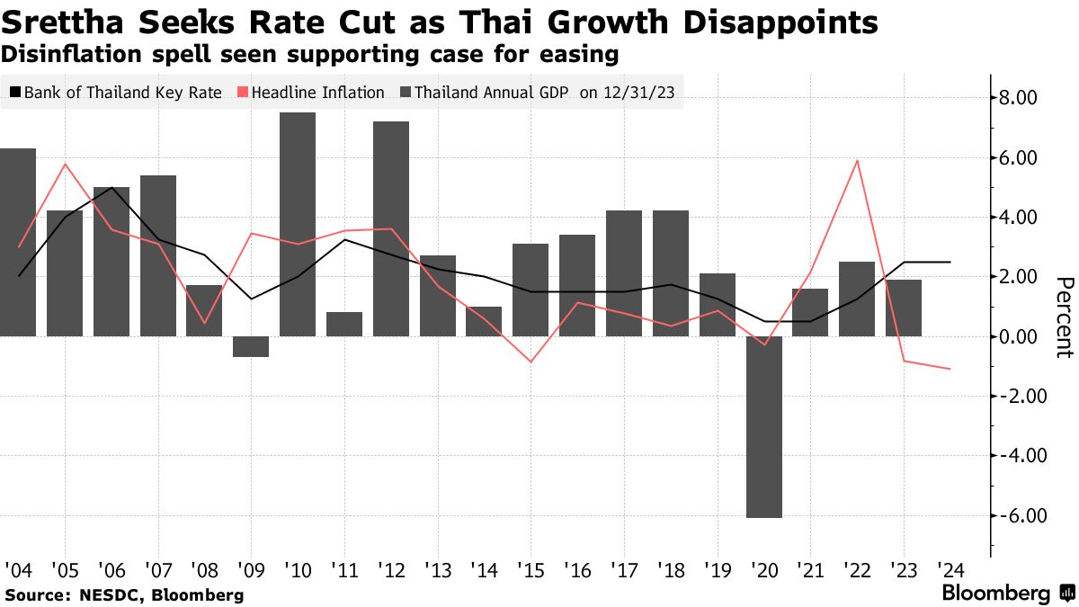 Srettha自8月上台以来一直与央行就振兴东南亚第二大经济体的方法存在分歧,周一深夜要求紧急货币政策审查以降低借贷成本,进一步加剧了紧张局势。这位前地产大亨在数据显示第四季度经济产出低于预期后,推动要求降低0.25个百分点的利率。