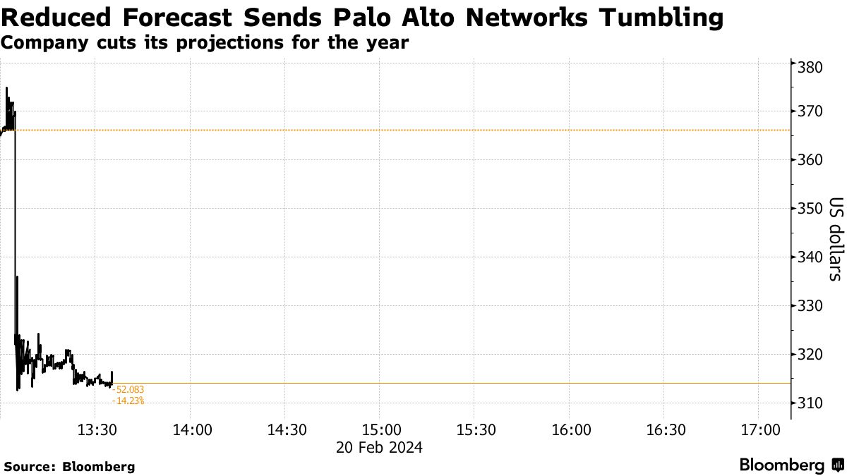 网络安全公司Palo Alto Networks Inc.在晚间交易中大幅下跌,因为它下调了本年度的营收预测,引发了客户在技术支出方面收紧的担忧。
