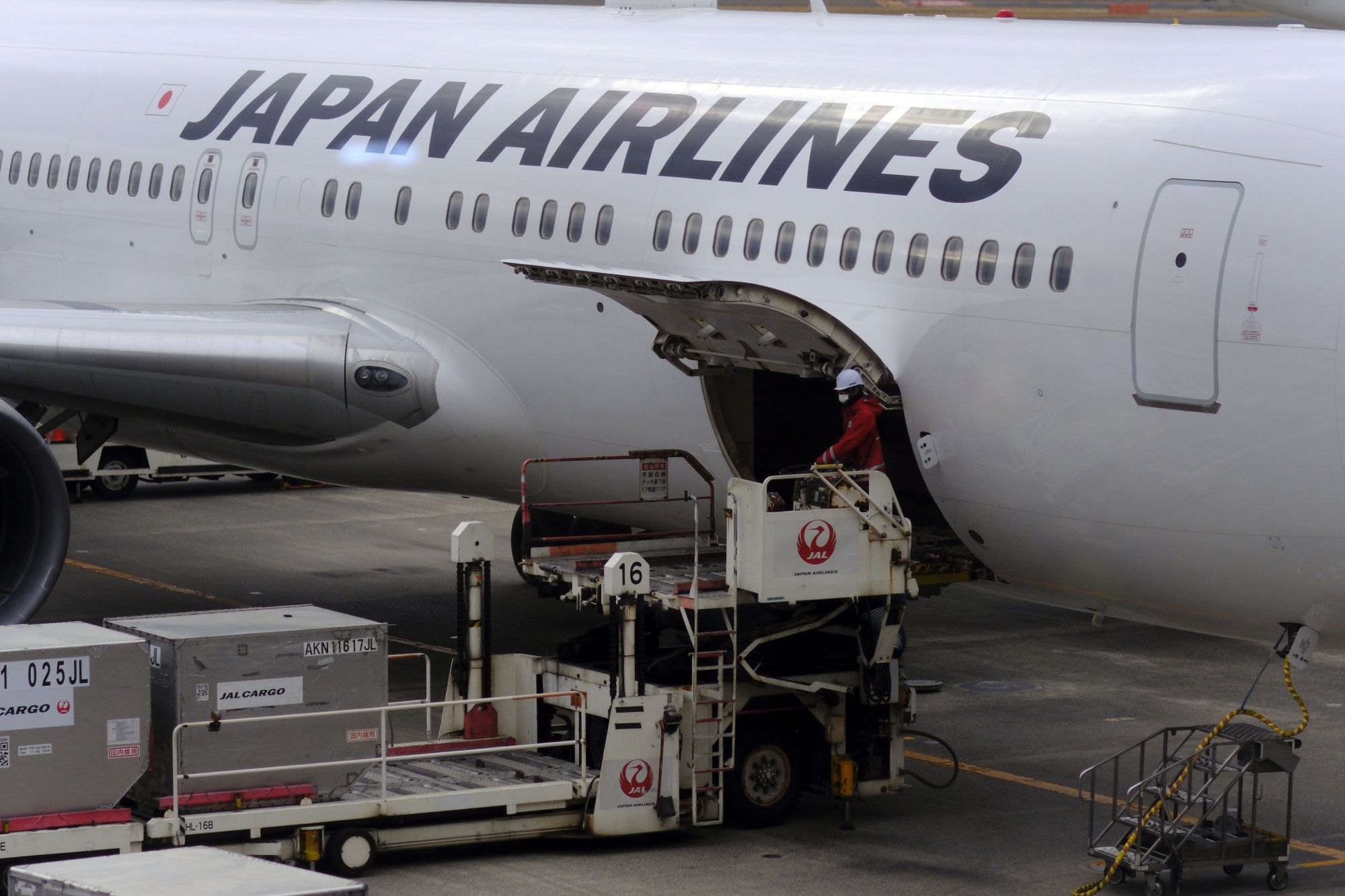 机场工作人员正在东京羽田机场从日本航空公司的飞机上卸载行李。