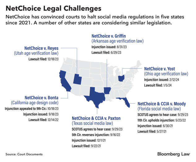 作为 Meta Platforms Inc.、TikTok Inc. 和 X 公司的成员,这家总部位于华盛顿的贸易协会已经赢得了对五个州的调节社交媒体法律的禁令。