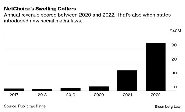 它并不公开披露每个成员捐款的金额,但根据公开的税收记录,NetChoice的总收入从2020年的300多万美元跃升至2022年的3400万美元。该组织还在26个州建立了游说机构,并于去年开设了一个新的诉讼中心。