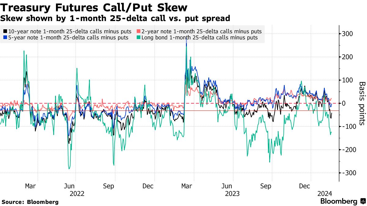 与过去一周期间期权市场上的活动相匹配,交易员继续支付更高的保值费用来对冲债券市场的抛售和较当前水平更高的收益率。在某些长期债券看跌期权上支付的保值费用可能开始反映出长期债券期货合约中最便宜交割的潜在变化以及围绕这种情况的对冲。