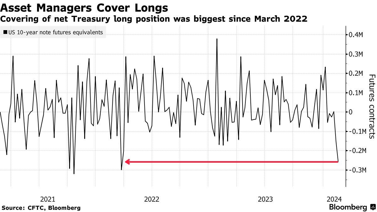 在国债期货市场上,最新的定位数据显示,资产管理人员解除了自2022年3月以来最大规模的净多头头寸,相当于近26万份10年期期货合约,这发生在包括2月13日较预期热的1月CPI数据的那一周。与此同时,上周五的持仓数据显示,生产者价格指数高于预期后,前端空头头寸正在增加。
