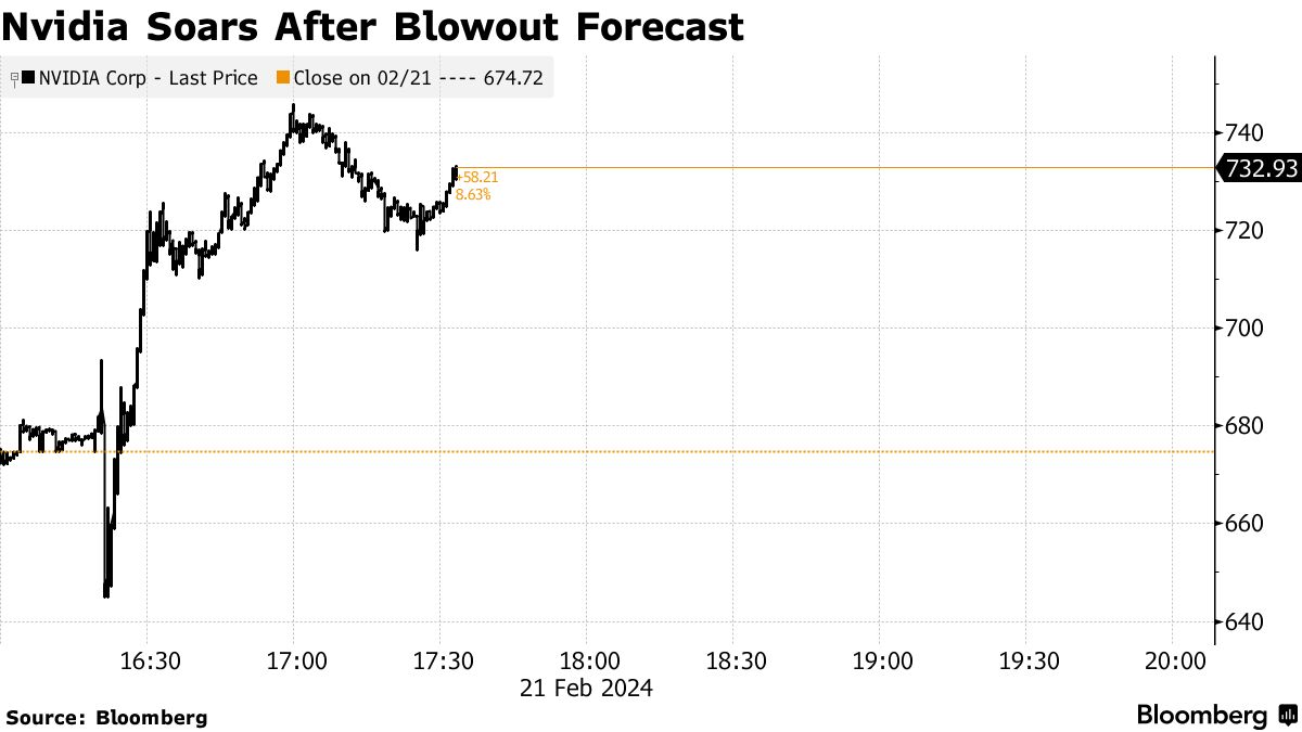 Nvidia Corp.在晚间交易中大幅上涨,因发布了另一个令人瞠目的销售预测,为已经使其成为全球市值最高的芯片制造商的股票涨势增添了新的动力。