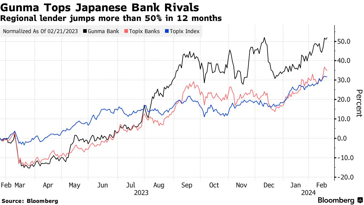 投资者开始相信这个故事。群马银行股价在过去12个月上涨了50%以上,表现优于Topix银行指数和日本主要股票指数。海外投资者持有该银行约20%的股份,市值约为23亿美元。