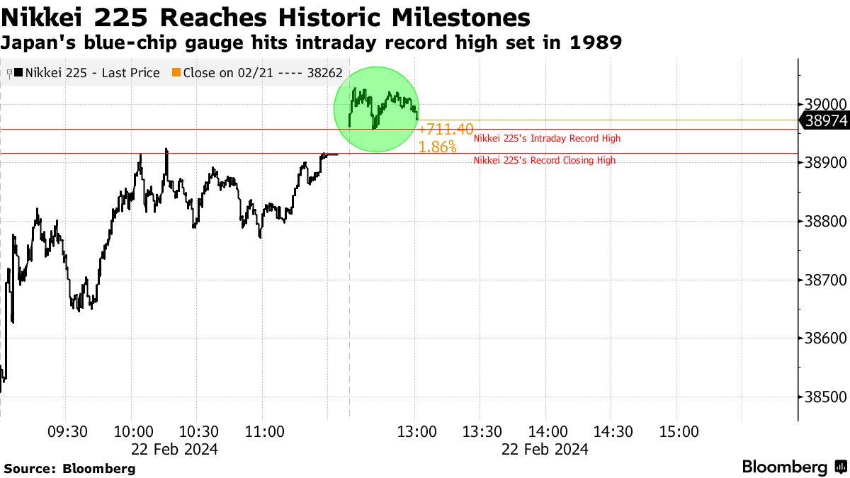 日本的基准日经指数短暂达到历史最高水平——彭博社