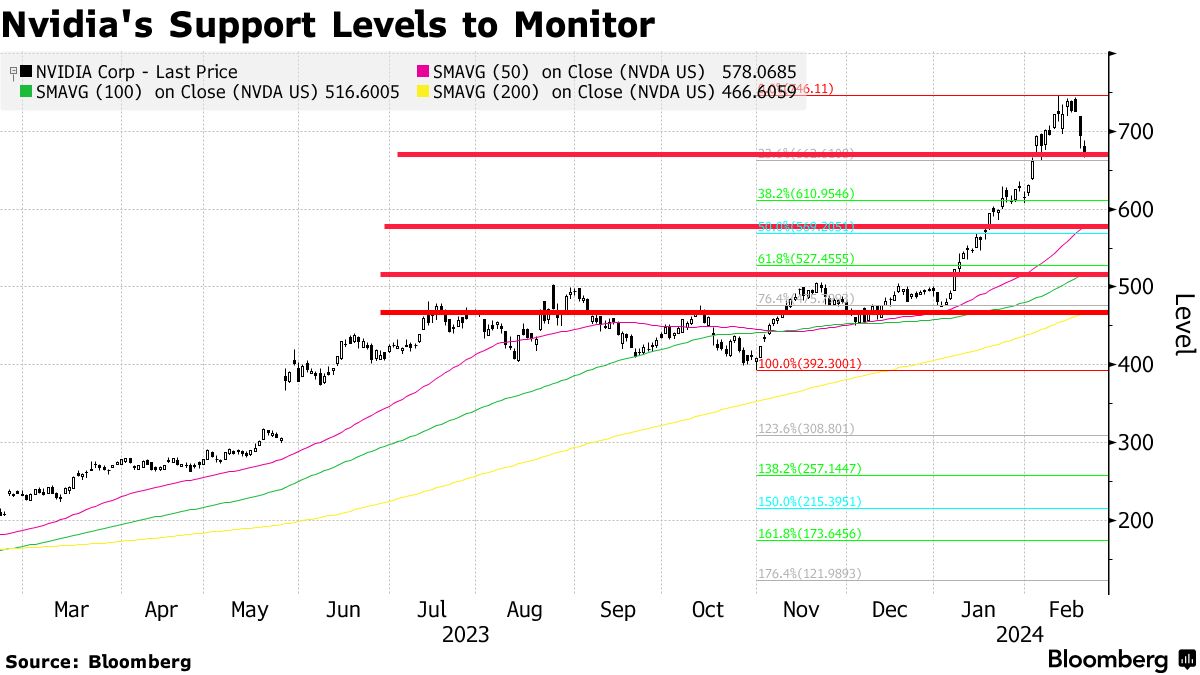 一个关键的关注区间是在670美元至680美元之间,技术分析师表示,这一区间在今年初1月份股价突破500美元后上涨了约34%之后,成为了支撑位。当然,还有英伟达的50日移动平均线,大约在578美元左右。