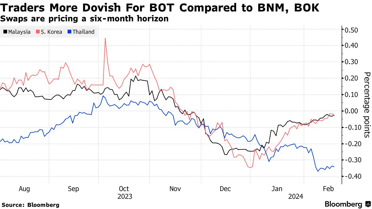 “我们已经看到泰国GDP在通货紧缩的背景下下降至2023年的1.9%,”美国道富环球投资者亚太固定收益主管Kheng Siang Ng表示。“市场预计很快会出现降息,这并不奇怪。”