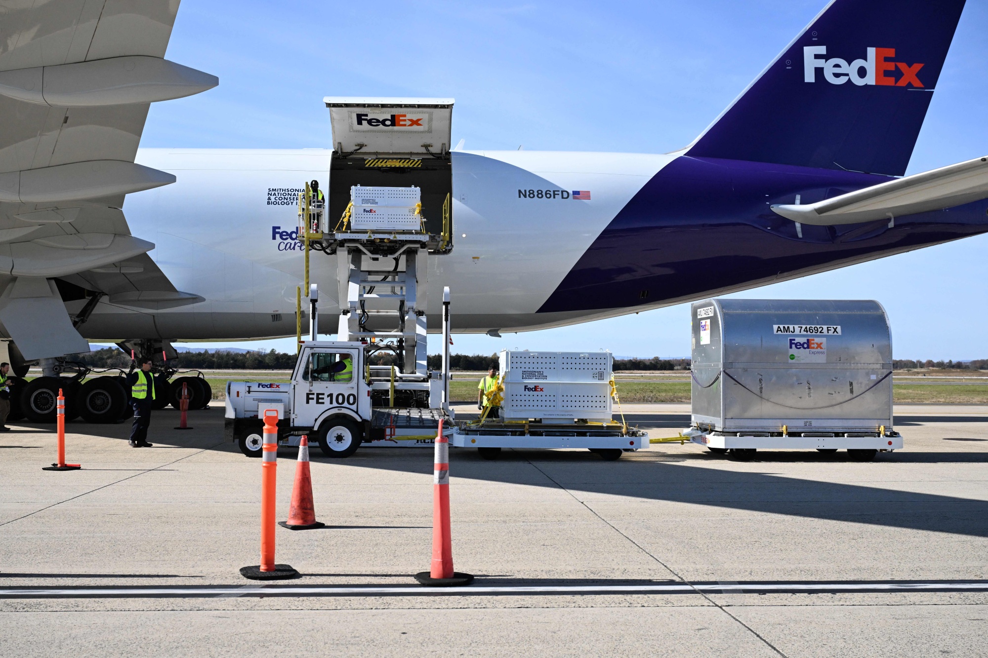 工作人员在2023年11月在杜勒斯国际机场装载一只装有大熊猫甜甜的板条箱,另一只装有美香的板条箱等待货运。摄影师:Jim Watson/AFP via Getty Images)阅读更多: 美国动物园的所有熊猫都将被中国带回
