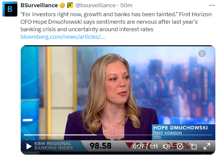 First Horizon Corp.首席财务官霍普·杜莫夫斯基为我们讲解了地区银行如何评估收紧的贷款市场、经济增长的韧性以及华盛顿对合并的悲观情绪。