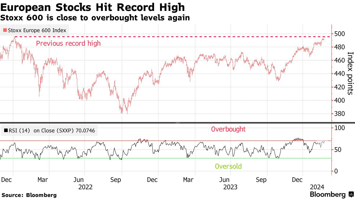 欧洲基准指数今年以来上涨,押注全球经济增长弹性和世界上最有影响力的央行可能降息。然而,投资者的仓位配置已经过度,斯托克600指数接近技术超买水平,一些市场参与者认为这是一次抛售的前兆。