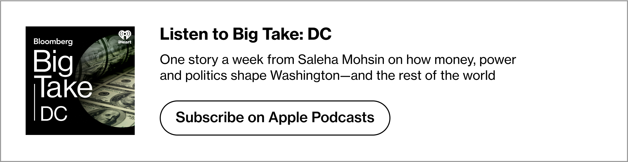 在iHeart,Apple Podcasts,Spotify, Bloomberg Carplay或您所在的任何地方收听并订阅Big Take DC播客。每周在节目中,我都会分享一个关于金钱、政治和权力如何塑造华盛顿的故事——以及对美国和全世界人民的影响。