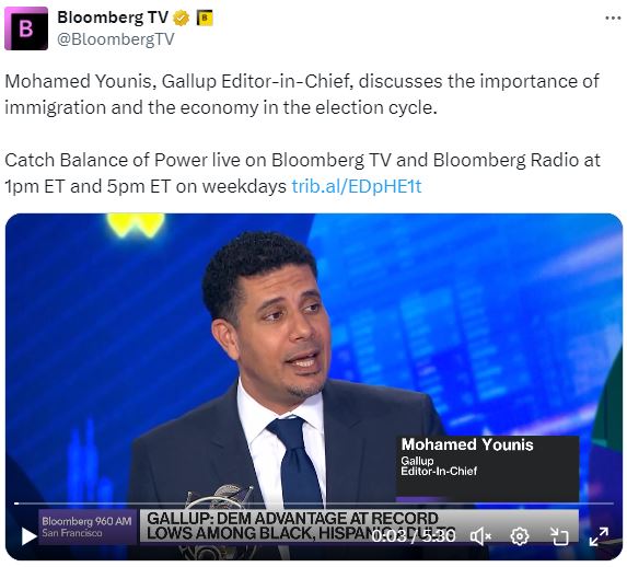 今天在彭博电视台的权力平衡早间版节目中,主持人乔·马修和凯利·莱因兹采访了盖洛普公司总编辑穆罕默德·尤尼斯,谈论了选民对拜登和特朗普的看法。