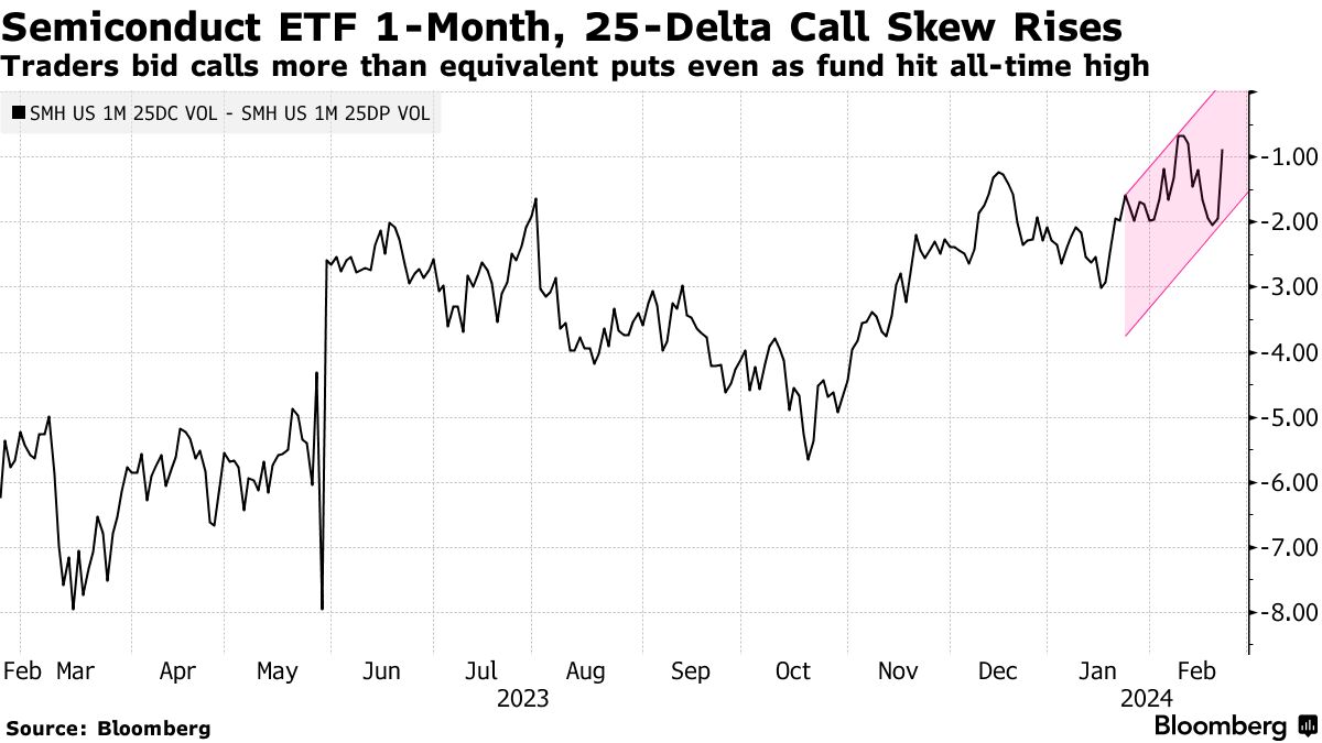 另一个看涨头寸的迹象是,范埃克半导体(代号SMH)的一个月期认购期权偏离率接近历史高位,表明相对于认沽期权存在额外需求。值得注意的是,这种对持续涨势的押注是在该交易基金已经在一天内上涨了约7%至创纪录水平时进行的。