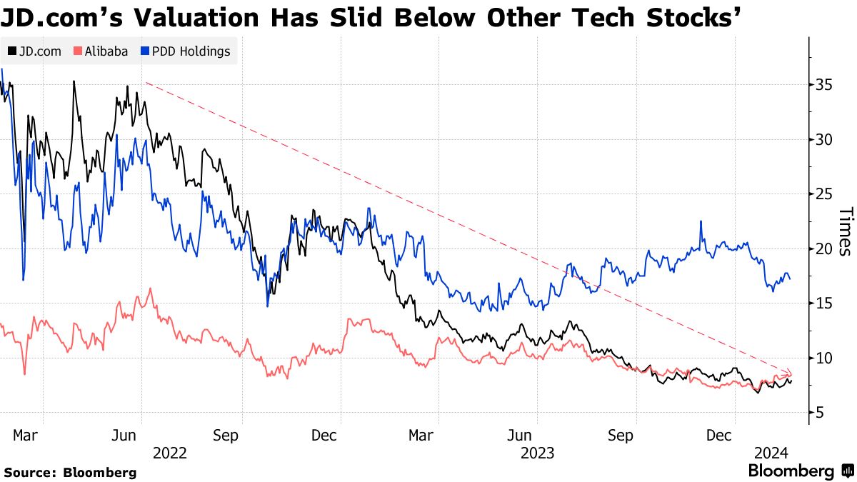 从积极的一面来看,除了陷入困境的美团外,京东的估值倍数在过去一年中下降得比任何一家中国主要科技股都多,据彭博编制的数据显示。现在它是同行中最便宜的之一,约为未来盈利预期的8倍。问题是,这是否足够理由来购买它。
