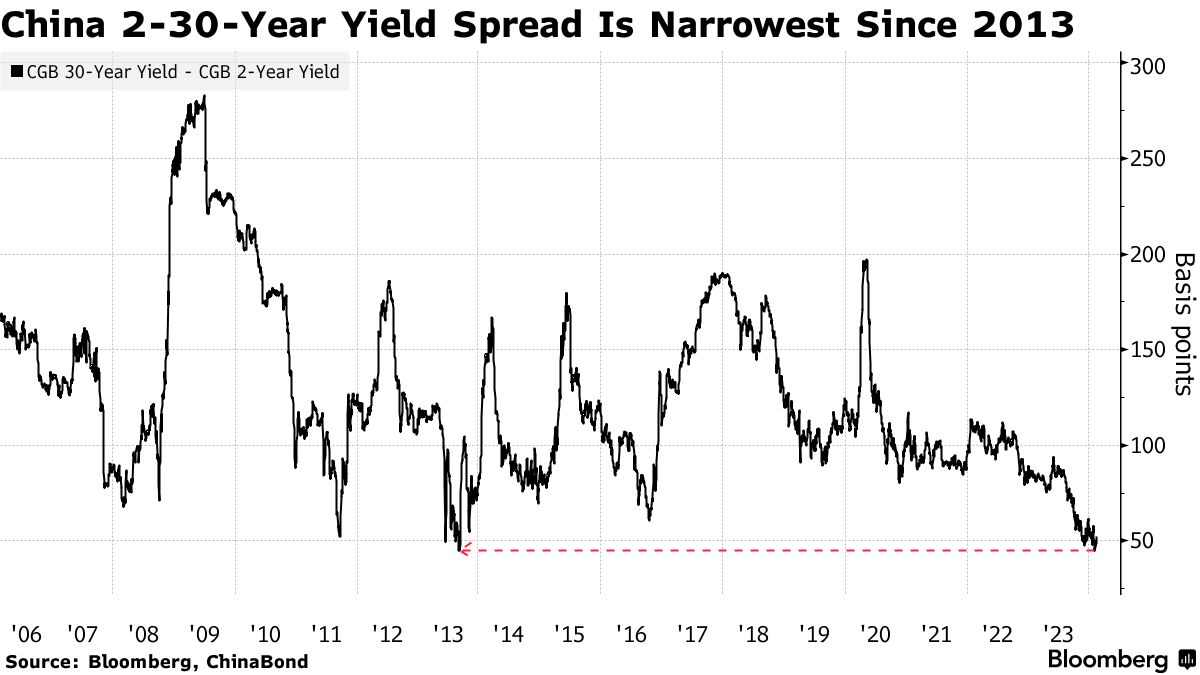 中国国债30年期收益率与2年期同行的额外收益率已经收窄了一年多,本月甚至跌至10多年来的最窄水平。这表明交易员对增长前景越来越悲观,这是由于长期的房地产危机和持续通缩。许多分析师认为,随着宽松预期不断被推迟,曲线将保持相对平坦。