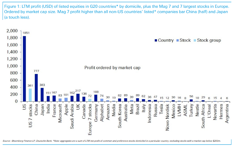 这很关键。1999年,大公司的估值被抬高到荒谬的程度,但小公司的股价却飙升。今天的情况并不像当年的小盘股那样。我认为,问题是一个真正全新的问题。相对于其他公司,公司规模从未如此庞大。我当然记不得任何一组公司业绩对整个金融世界的影响能像本周的英伟达那样重要。但这是有道理的,因为正如里德展示的这张精彩图表所示,这七家公司现在比你平均国家还要大。它们的收入超过了除美国、中国和日本之外的任何国家(日本的收入仅略高一些):