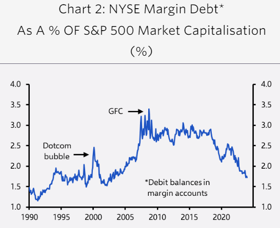 在金融市场中,相对较少的证据表明存在过度使用杠杆,即使较高的利率并没有像预期的那样减缓美国经济。伦敦资本经济学家约翰·希金斯提供了这张图表,显示纽约证券交易所的保证金债务在市场飙升的最近几周已经大幅下降: