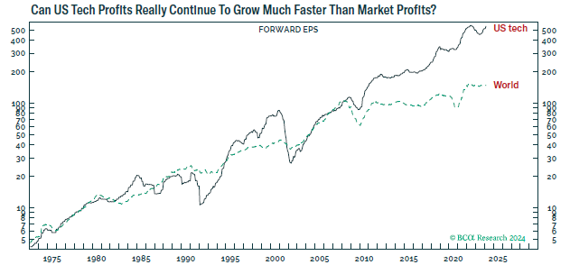 因此,基于这一点,现在不是购买美国股票的好时机,但情况可能会变得更加紧张。每个人都期待的联邦基金利率下调将是一次考验。Gavekal的威尔·丹耶尔认为,持续的涨势“很可能取决于以下一项或两项因素:(i)盈利继续超出预期;(ii)美联储降息,实际债券收益率下降—没有衰退。” 任何一种情况都可能发生,但都不是确定的。