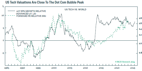 是的,美国市场真的很糟糕。 (其他很多市场看起来便宜得多。)美国科技股相对于世界其他地区的价格几乎和2000年一样昂贵。这张图表来自BCA研究的达瓦尔·乔希: