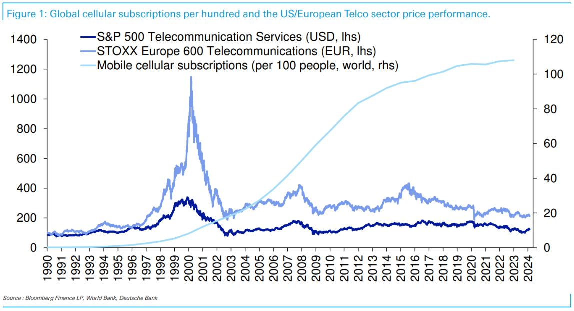 中断。摄影师:Patrick T. Fallon还有一个问题,那就是我们是否能够购买到人工智能带来的增长。2000年,总的来说,我们做不到:谷歌还没有上市,Facebook也不存在。在淘金热潮中,Joshi指出,人们有一种购买“镐和铲”的本能——这些基础设施使人们能够淘金。这或许可以解释人们对英伟达芯片需求的巨大增长,因为人们可能过度武装自己以获取人工智能的镐和铲。这也解释了思科在2000年初短暂成为全球最大公司,以及上世纪90年代围绕移动通信的狂热。问题在于,即使一项技术实现了所有最大的期望,比如每个人都在口袋里装了一部电话,看起来像是直接利益相关的公司也不一定会获利。里德的图表将移动电话的增长与电信股票的表现进行了比较: