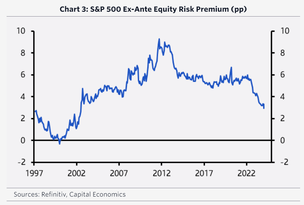 再次强调,我们还没有达到极端,而且无论如何,估值对于时机来说都很糟糕。凯恩斯说过,市场可能会持续非理性地长时间,超过大多数人的偿付能力。但重要的是要注意,股票相对债券确实看起来很昂贵。这张图表也来自希金斯,显示了股权风险溢价的简单衡量标准——你从股票相对于债券获得的额外收益。这是二十年来最低的(意味着股票最昂贵)。它远不及1999-2000年那么疯狂,当时溢价竟然变成了负值: