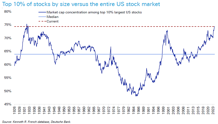 任何关注过“辉煌七人组”科技股的人都会意识到目前市场非常集中。有不同的衡量方法;但都不令人鼓舞。这是德意志银行的吉姆·里德的数据,衡量了标普500指数中前10%股票的权重: