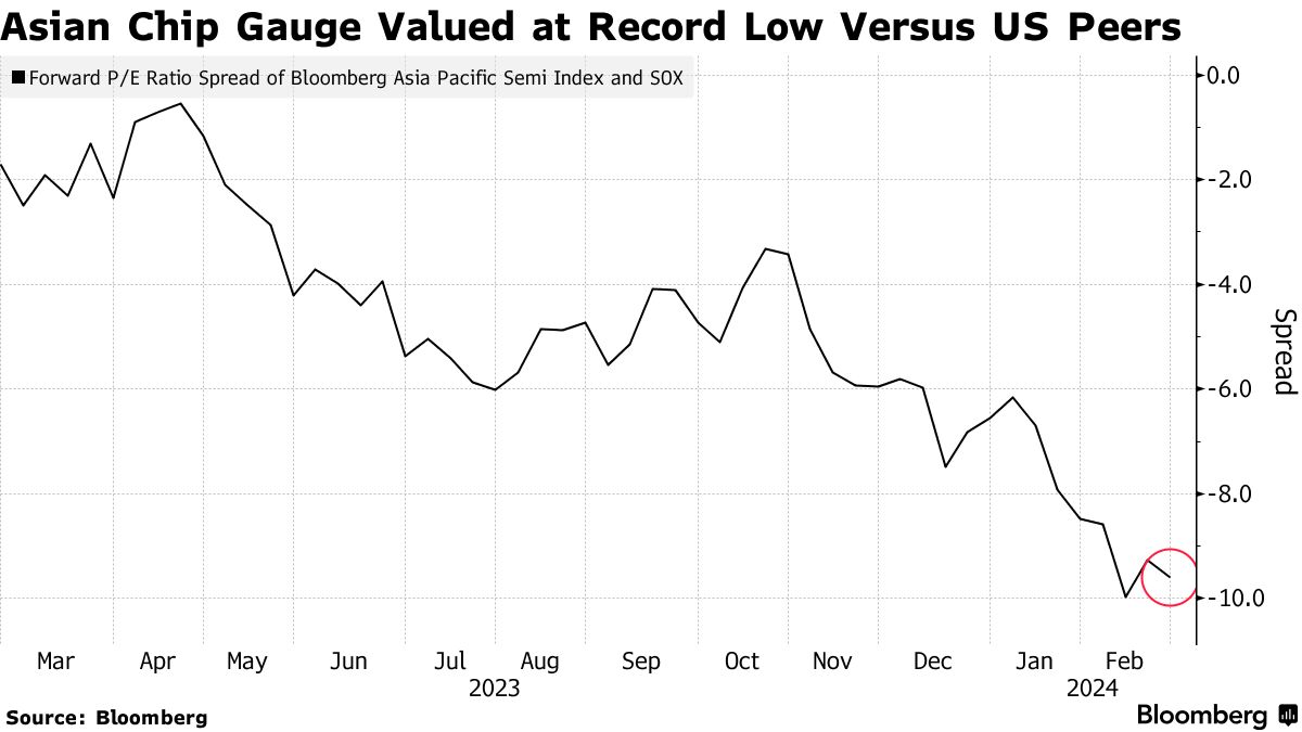 彭博指数追踪亚洲顶尖半导体公司,包括台积电和三星电子,本周扩大了与费城半导体指数的表现差距。尽管亚洲指数以17倍的前瞻收益交易,美国指数则为27倍,使得差距接近创纪录,英伟达的业绩预期强劲推动投资者对生成式人工智能的繁荣充满信心。