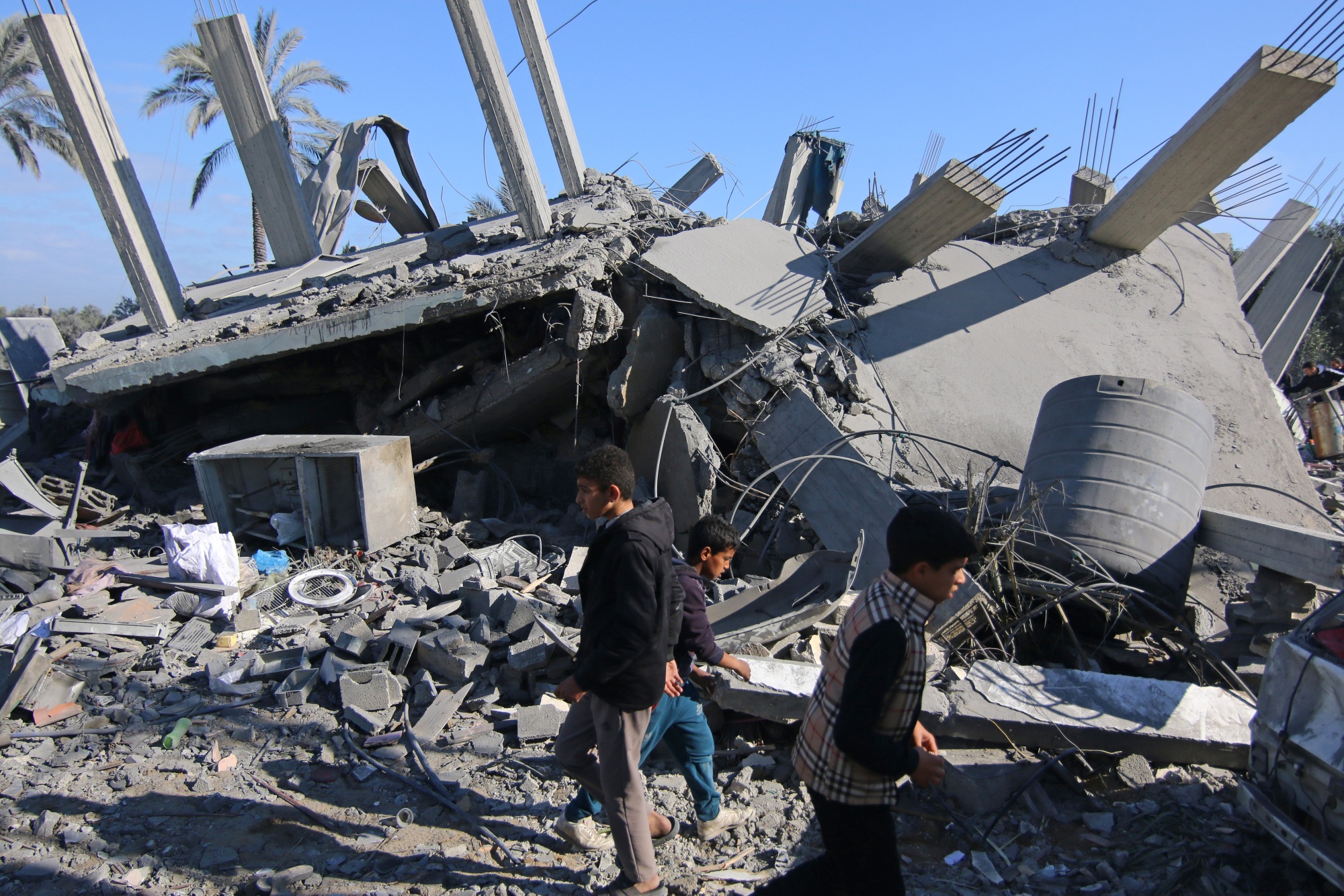 巴勒斯坦人在加沙中部祖韦达区一栋倒塌建筑的废墟上行走,这是2月22日以色列空袭后的景象。摄影师:Ahmad Salem/Bloomberg