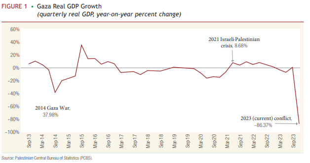 世界银行表示,在加沙地带,国内生产总值在第四季度下降了80%以上。产出从第三季度的大约6.7亿美元下降到接下来的三个月内的大约9000万美元。