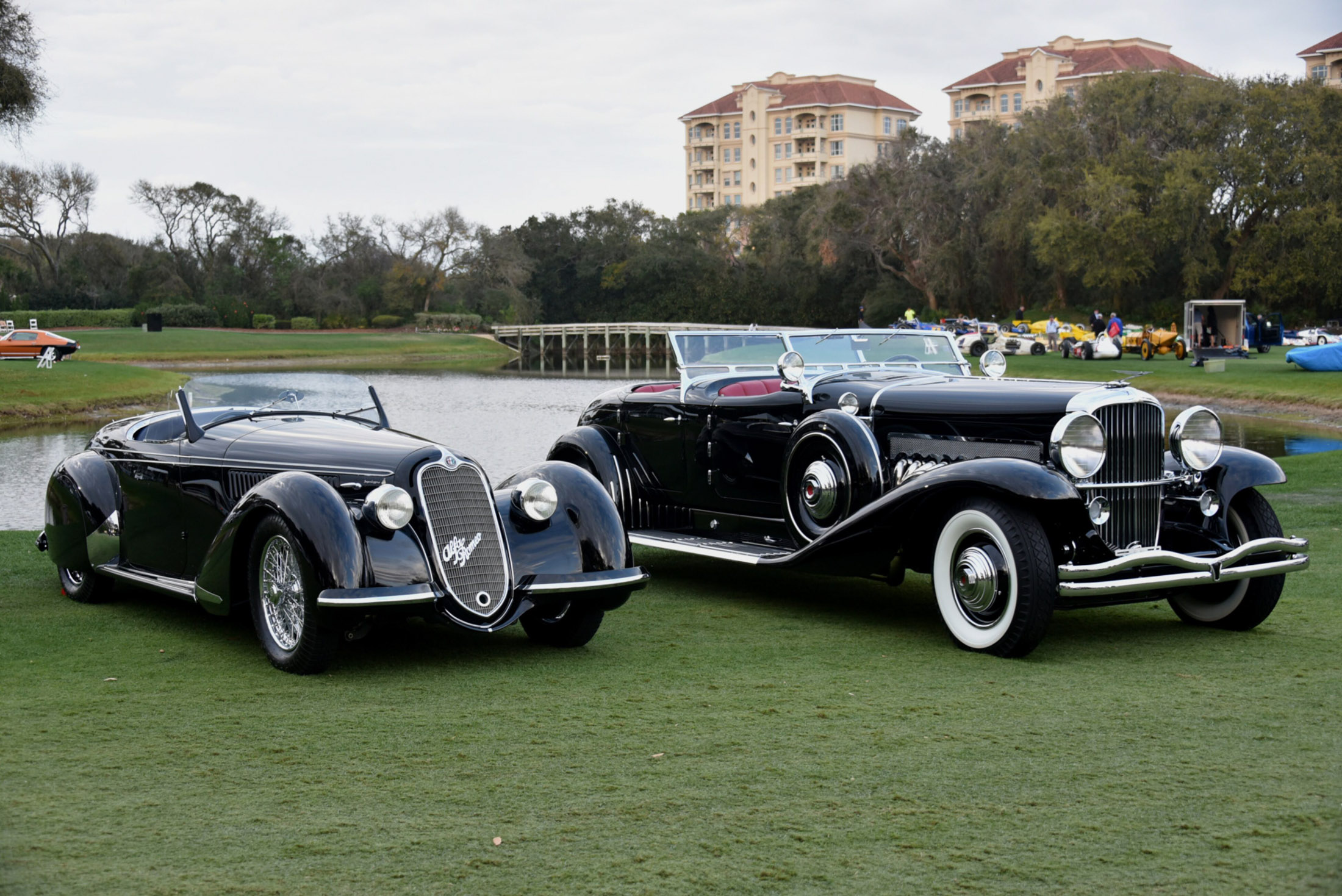 1939年阿尔法·罗密欧汽车公司SpA 8C 2900敞篷旅行车,左边,以及1939年杜森伯格Model SJ敞篷豪华车在2017年亚梅利亚岛汽车优雅大赛期间展出。摄影师:马克·伊利亚斯/彭博社南部的这场对决可能最大的赢家是汽车展参赛者们自己,因为竞争对手都在竭尽全力给他们留下深刻印象。在阿梅利亚,创始人比尔和简·沃纳会在参赛车辆驶入展示场时迎接他们,并且整个周末都会在里茨的走廊上走动,与朋友和同事握手,询问他们的孙子女和假期计划。Hagerty表示,他不会放弃保持顶级委托人的亲切接触。他表示,他专注于确保他的客人“获得个性化的款待,并在活动结束时比到达时更加与全球汽车文化联系紧密。”