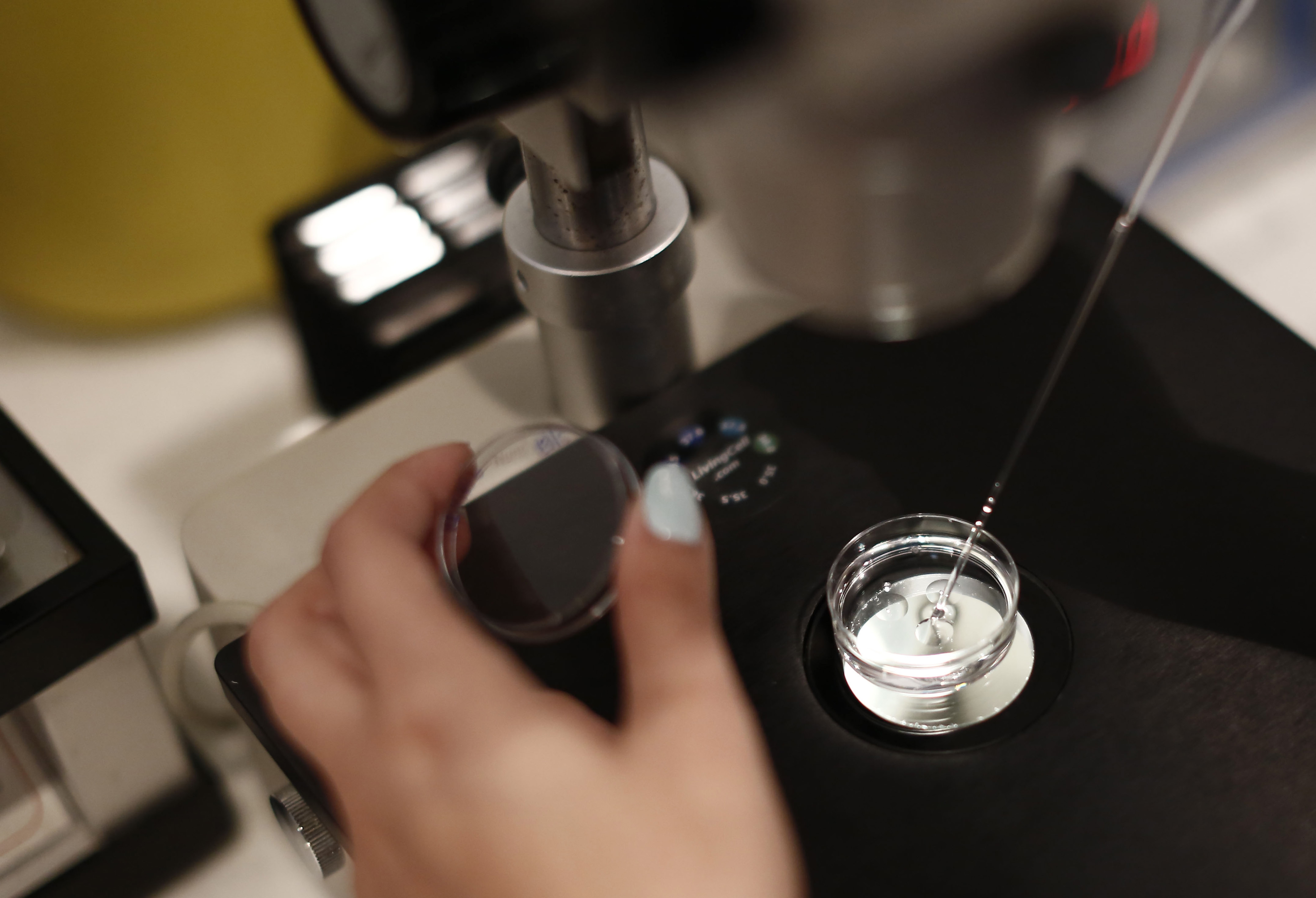 一名员工在体外受精实验室中使用液体溶液。