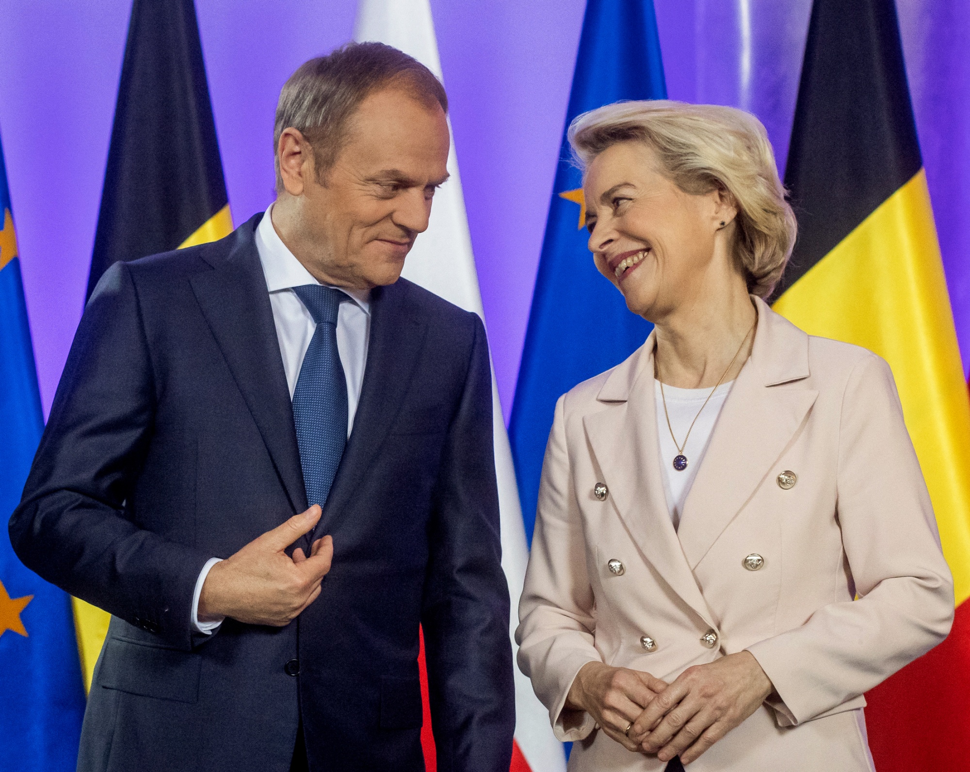 唐纳德·图斯克(Donald Tusk)左,乌苏拉·冯·德·莱恩(Ursula von der Leyen)右,于2月23日在华沙。