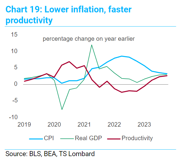 这一次,通胀激增造成的损害有所减轻。虽然生活成本激增确实重创了购买力,但家庭有疫情储蓄,雇主在经济首次重新开放后发现很难招人,因此他们避免裁员。现在通胀已经回落,实际工资正在上升,然而,早期时代看到的好处可能仍会出现,生产率正在加速增长。