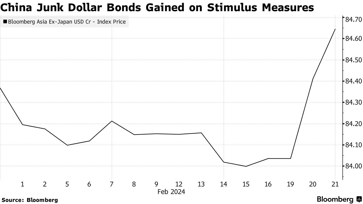 根据彭博编制的指数,中国垃圾美元债券,主要由房地产开发商的票据主导,周二出现了近一个月来最大的单日涨幅。此次上涨是在中国银行降低五年期贷款基准利率25个基点至3.95%之后出现的。