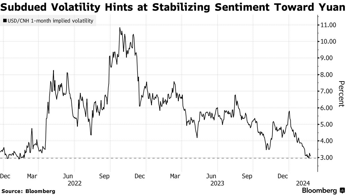 离岸人民币在九月份跌至近一年来最低水平后已稳定在7.2美元左右。美元兑离岸人民币一月隐含波动率接近2022年以来的最低水平,表明交易员不太预期短期内会有大幅波动。