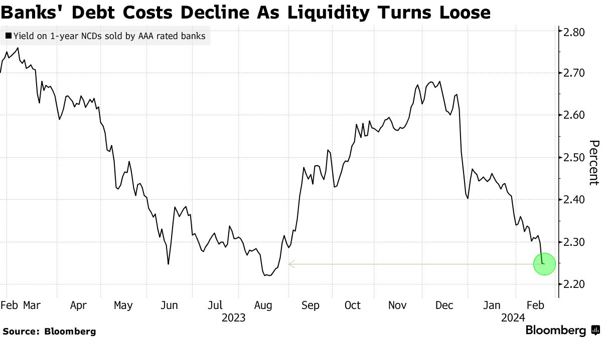 中国人民银行在二月份降低存款准备金率,有助于缓解金融体系的流动性压力。由AAA级银行发行的一年期可转让存单的成本本周下跌至自2023年8月以来的最低水平。