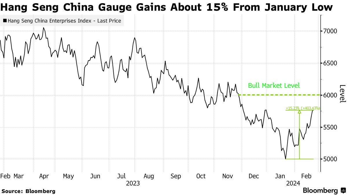 情绪转向最明显的地方莫过于股市。恒生中国企业指数是本月全球表现最佳的主要指数,这是去年它在全球排名垫底时的一个显著转变。该指数已经实现了自重新开盘以来的最大跌至峰涨幅,使其距离进入所谓的技术性牛市不到5个百分点。