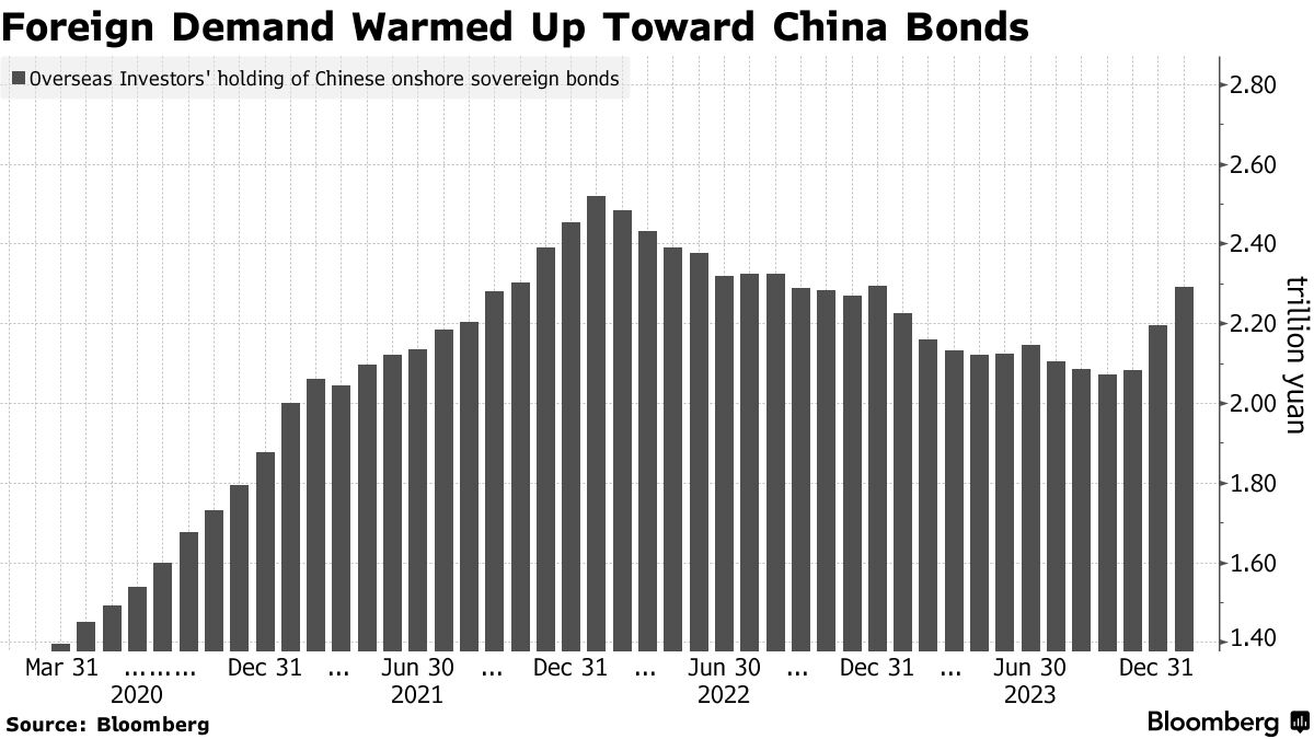 中国十年期政府债券收益率仍处于2002年以来的最低水平,因投资者押注央行将保持鸽派立场以支持经济复苏。这种增强的信心,再加上有利可图的收益套利交易,在过去一个季度推动资金重新流入全球第二大债券市场。