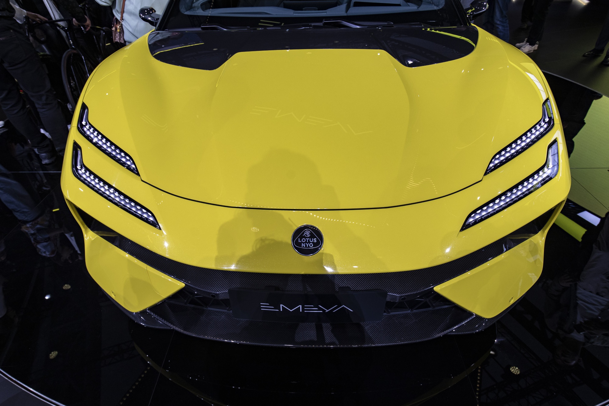 一辆Lotus Emeya跑车在中国广州举办的广州车展上展出。