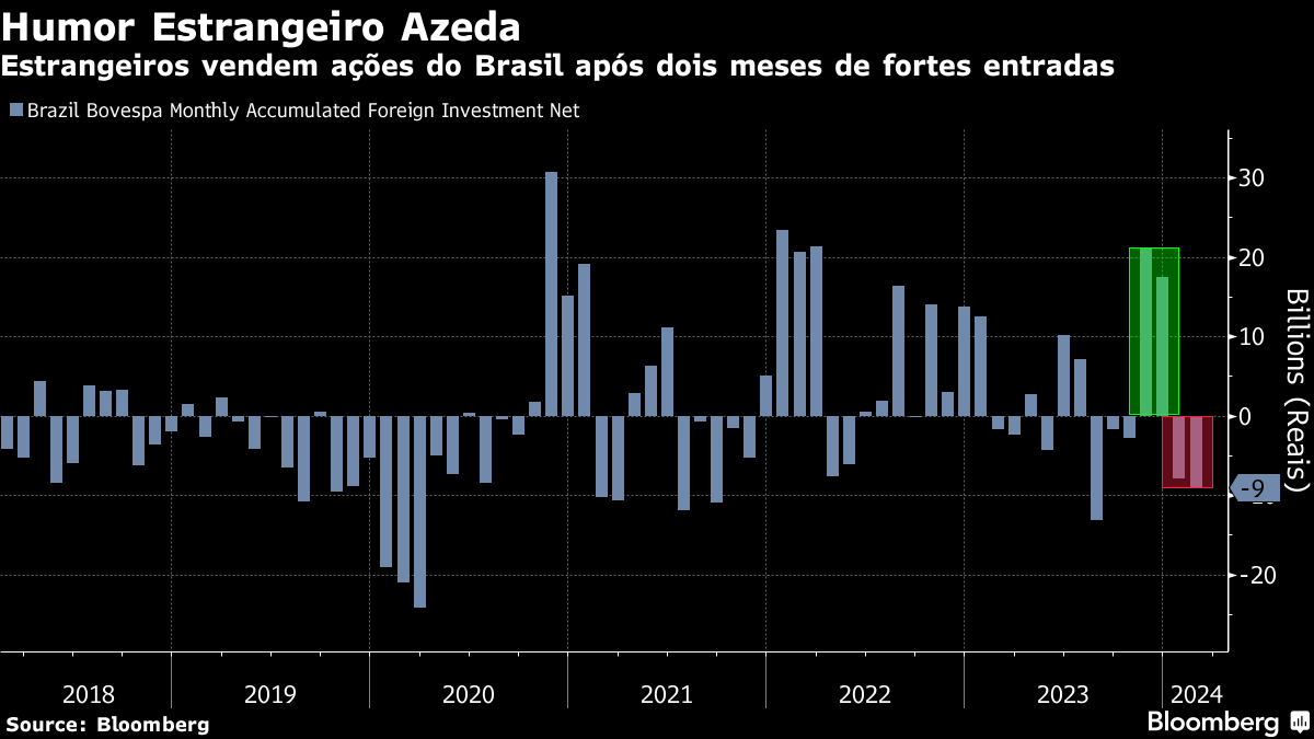 利率仍然处于吸引人的水平,这推动了本地投资者退出股市,并使基金的股票敞口降至历史低位,这使得Ibovespa受到外国投资者兴趣的影响 - 外国投资者的兴趣正在减弱。