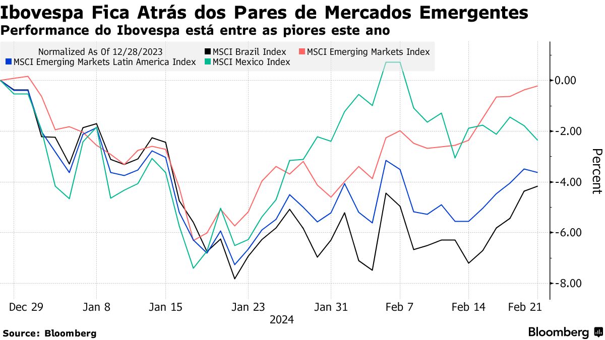 由于本地基金置身事外,Ibovespa在过去几个月里一直不稳定,受外部情绪影响。该指数在2023年最后两个月飙升了19%,随着外国投资者购买了385亿雷亚尔的股票。而在一月份,由于有人打赌美联储将会保持较长时间的高利率,导致79亿雷亚尔的资金外流,使得该指数下跌了4.8%。截至2月21日,外国投资者的资金外流已达到101亿雷亚尔。