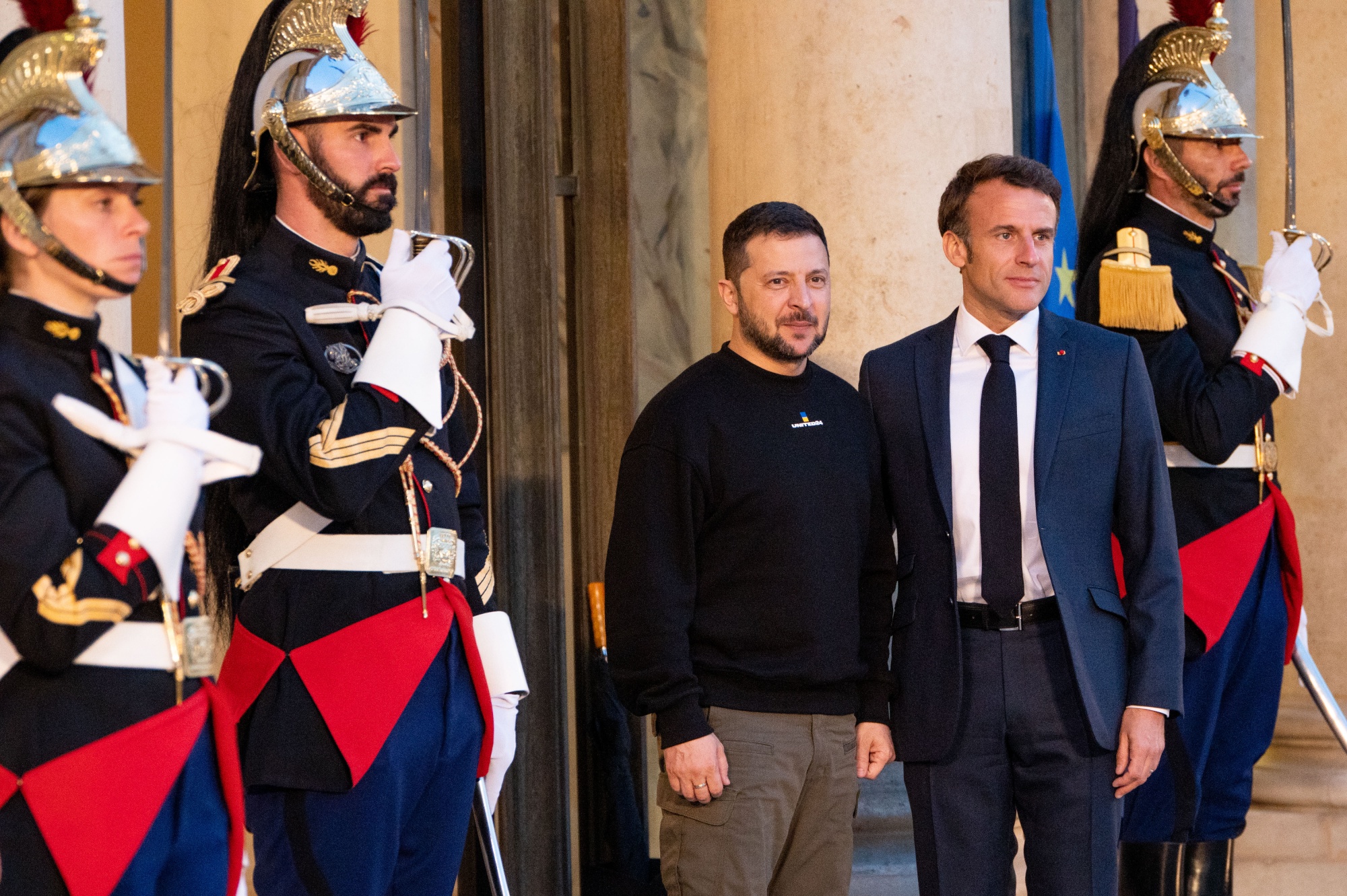 弗拉基米尔·泽连斯基,乌克兰总统,中央,和埃马纽埃尔·马克龙,法国总统,在2023年5月14日巴黎爱丽舍宫会面前。