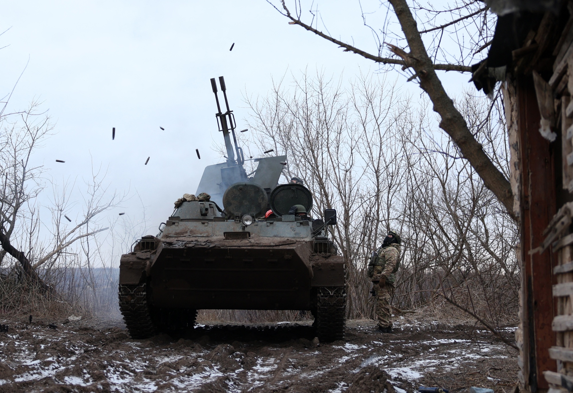 乌克兰防空炮手们在顿涅茨克地区的阵地上向敌机开火,2月20日。