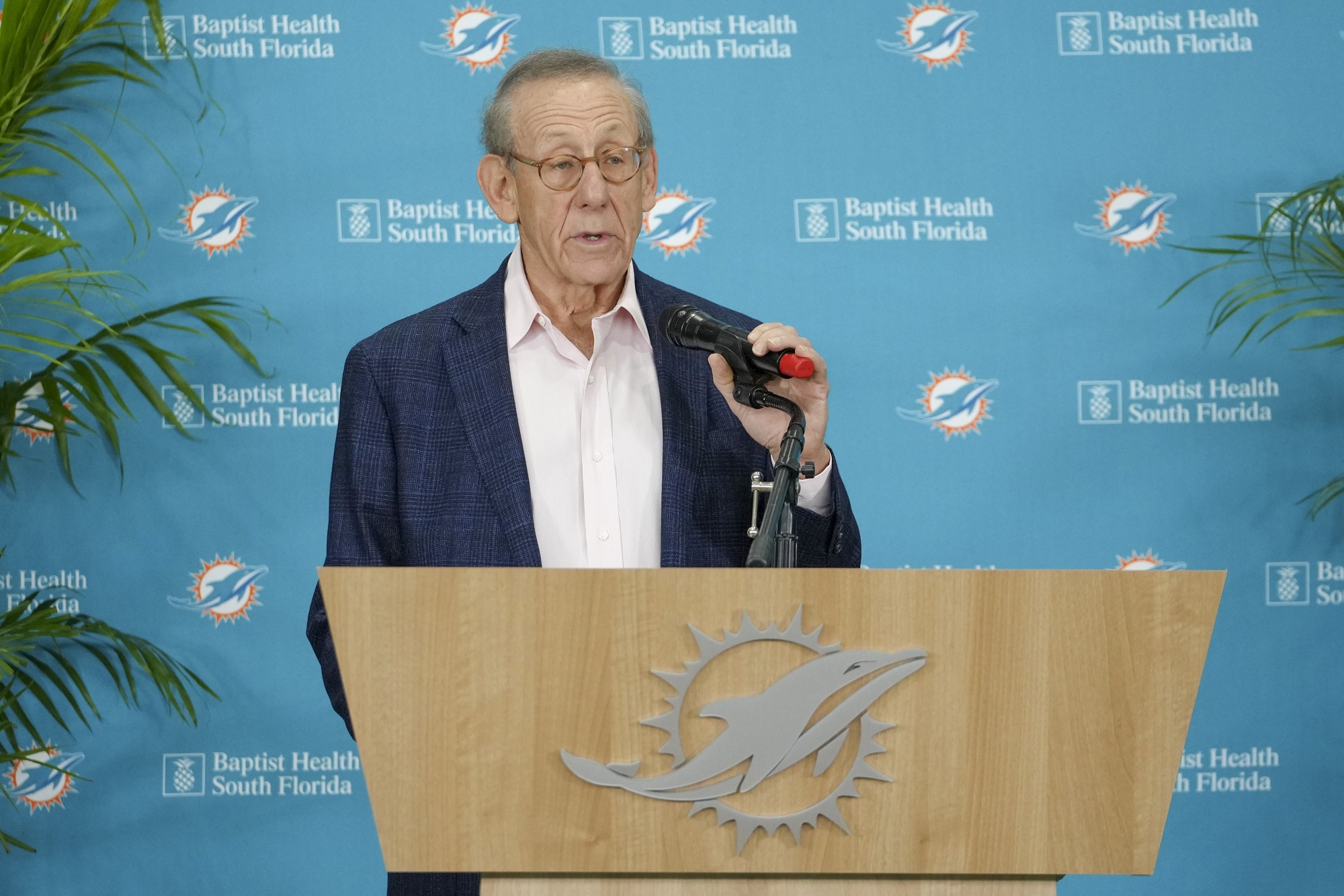 斯蒂芬·罗斯在佛罗里达州迈阿密花园市的浸信会健身训练中心接受媒体采访。
