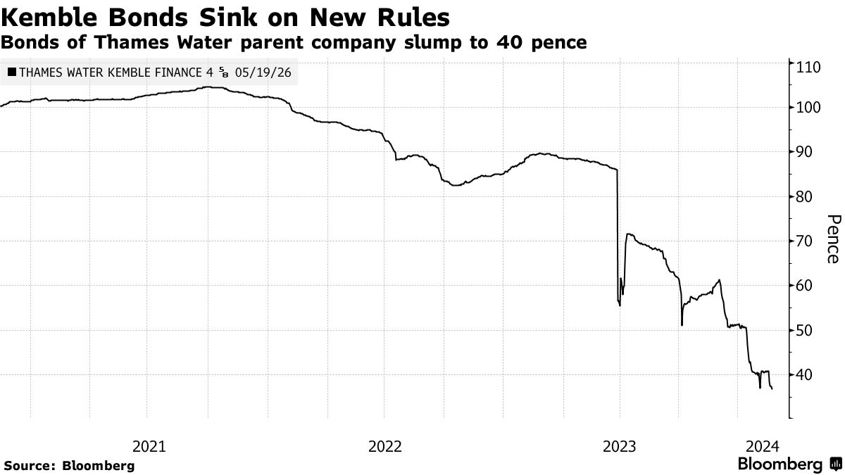 肯布尔(Kemble)还有一笔到期于2026年5月的4亿英镑债券。去年六月政府考虑将泰晤士公司国有化并且首席执行官萨拉·本特利(Sarah Bentley)突然辞职时,该债券的价格暴跌。上个月,当英国提出新的公用事业特别管理规定时,该债券再次下跌。