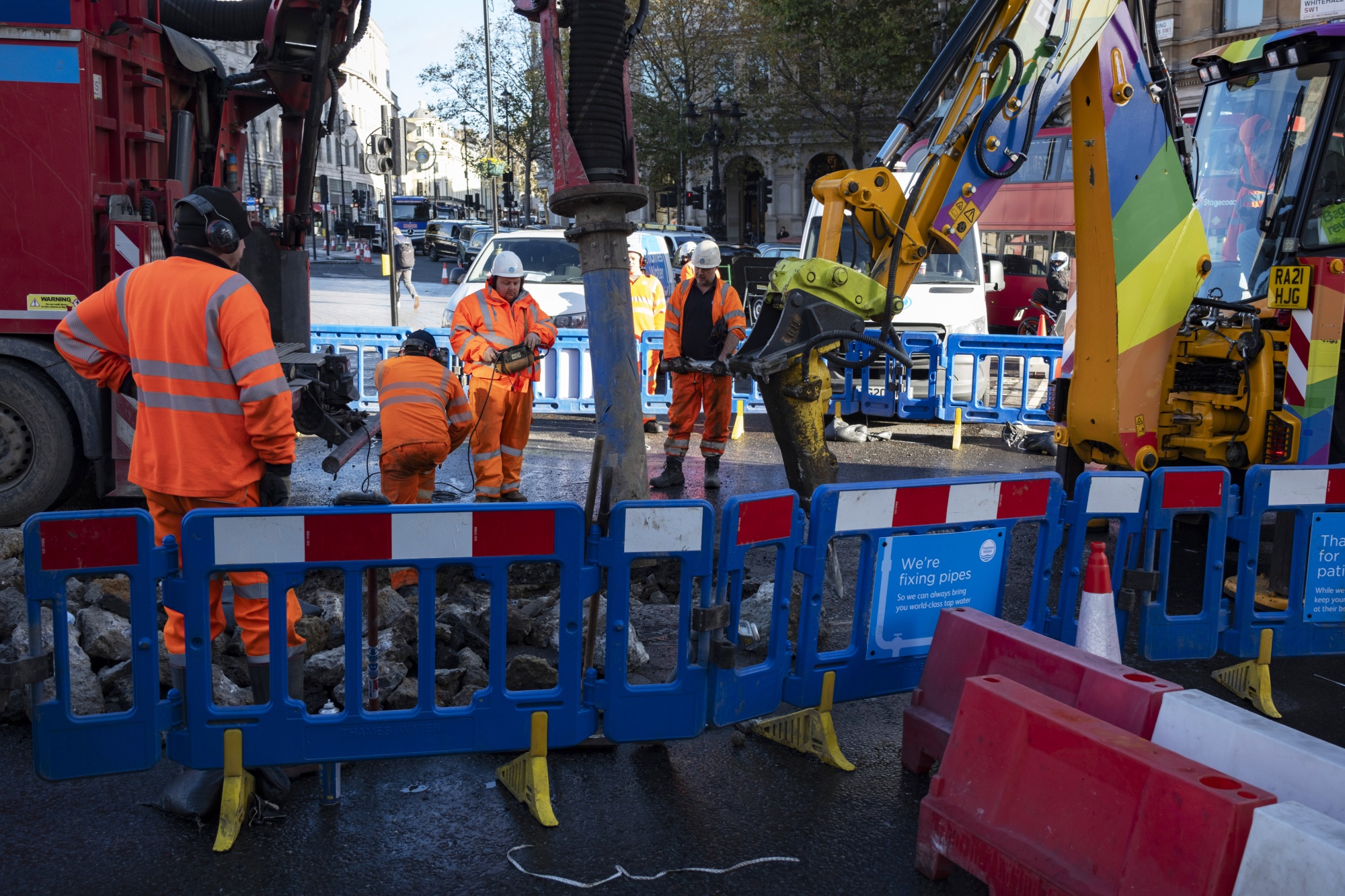泰晤士水公司去年在特拉法加广场修理管道。摄影师:迈克·肯普/图片来源:盖蒂图片社泰晤士水公司正在等待对其去年向投资者支付数百万英镑是否违反规定的裁决。对该公司的裁决可能意味着更多罚款,或者最糟糕的情况是将其推入破产。