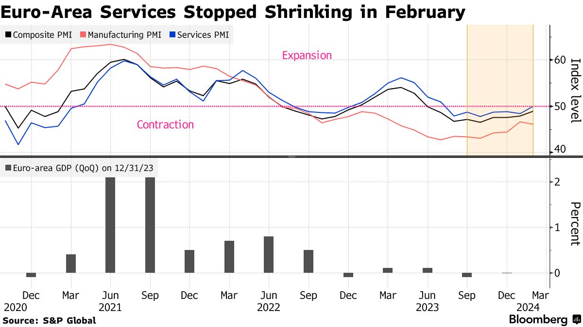 根据政府的估计,德国国内生产总值今年可能会略微增长,然后在2025年开始加速增长。尽管如此,整个欧洲其他地区服务业活动的增强推动了二月份欧元区私营部门活动指数达到八个月来的高点。