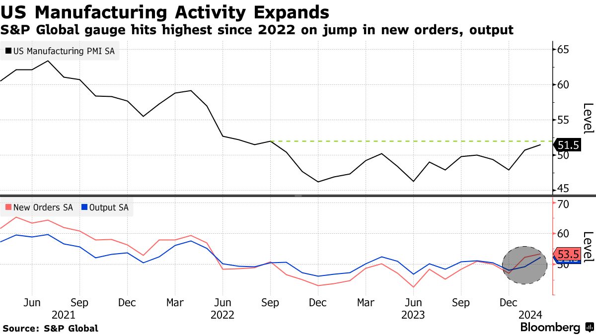 美国制造业活动扩张速度创下自2022年9月以来最快,得益于订单增长加快,表明生产商正在摆脱长期低迷。尽管只是温和增长,但该指数已连续数月首次显示增长超过一年。