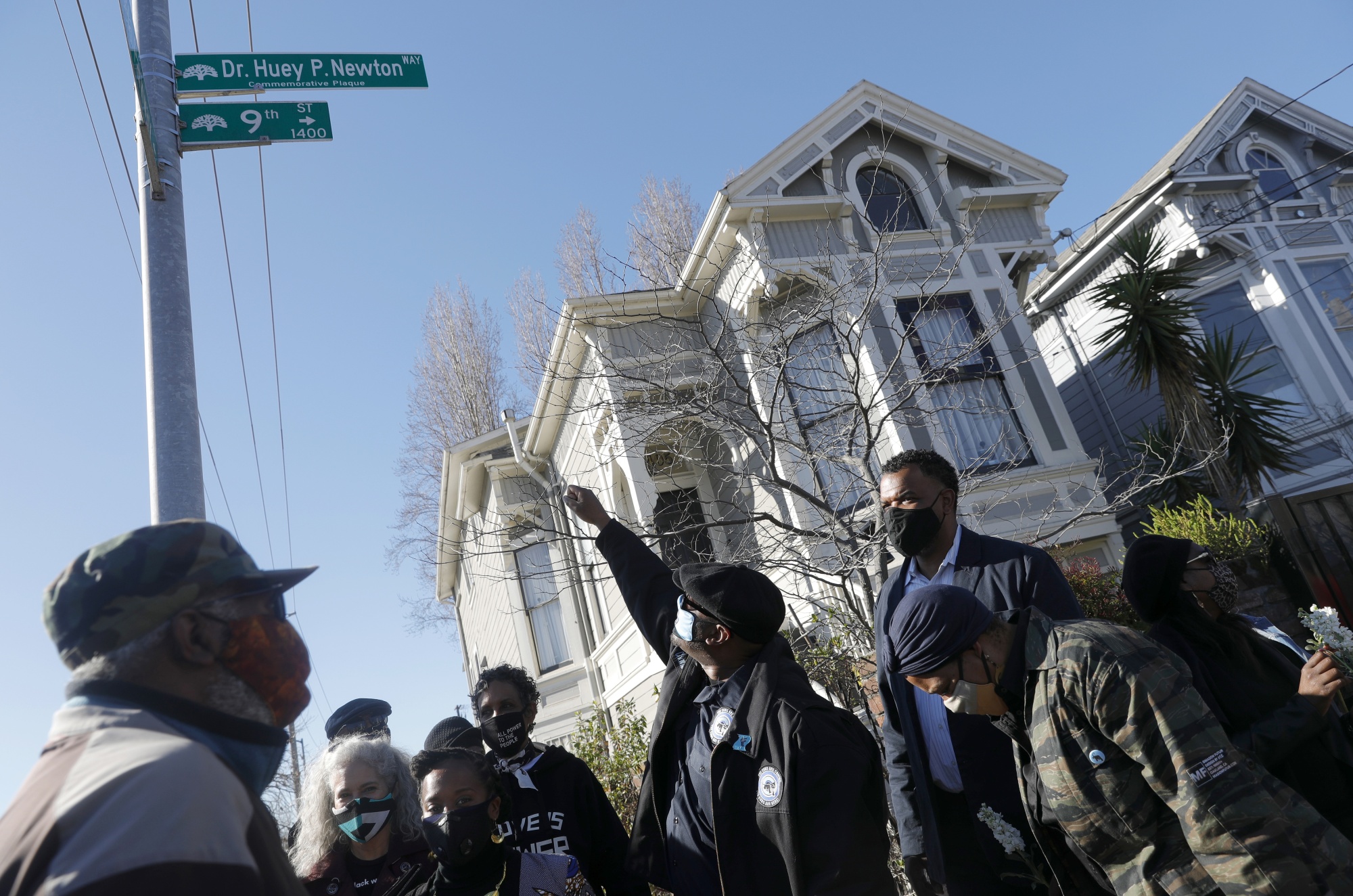 Fred Hampton Jr.,中间,参加了2021年在西奥克兰第9街一部分命名为“Dr. Huey P. Newton Way”的奉献仪式。摄影师:Jane Tyska/Digital First Media/East Bay Times via Getty Images过去,黑豹纪念活动面临着敌对的政治氛围。2006年,芝加哥的警察工会领导了反对市议会提议在汉普顿被枪击的街区安装一块荣誉“弗雷德·汉普顿主席之路”标志牌。2017年,特朗普政府取消了向加州大学伯克利分校提供的10万美元国家公园管理局拨款,用于收集黑豹党口述历史。